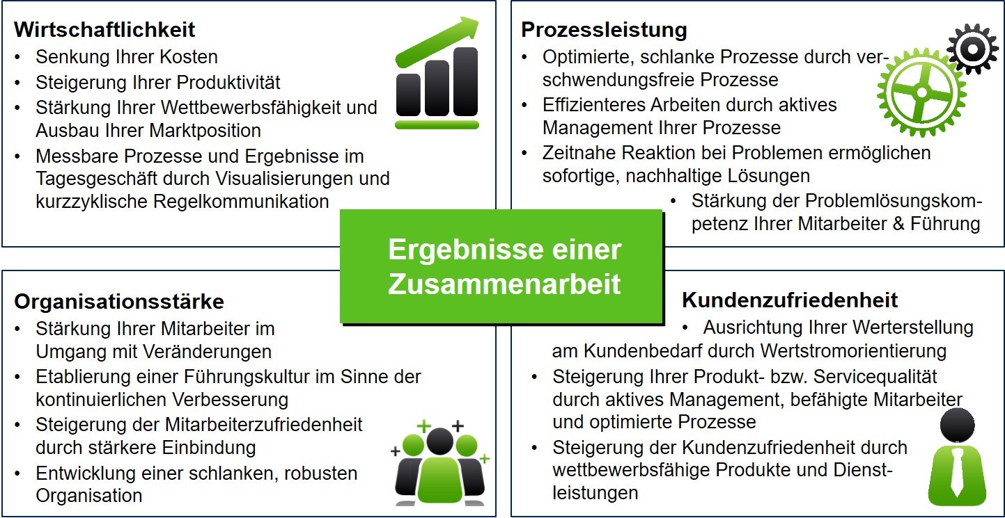 Bei der Verbesserung der Leistungsfähigkeit Ihrer Prozesse geht es um die Steigerung der Prozesseffizienz, die Reduktion Ihrer Kosten, die Erhöhung Ihrer Produkt- und Servicequalität sowie die pünktlichen Lieferung Ihrer Dienstleistungen und Produkte.